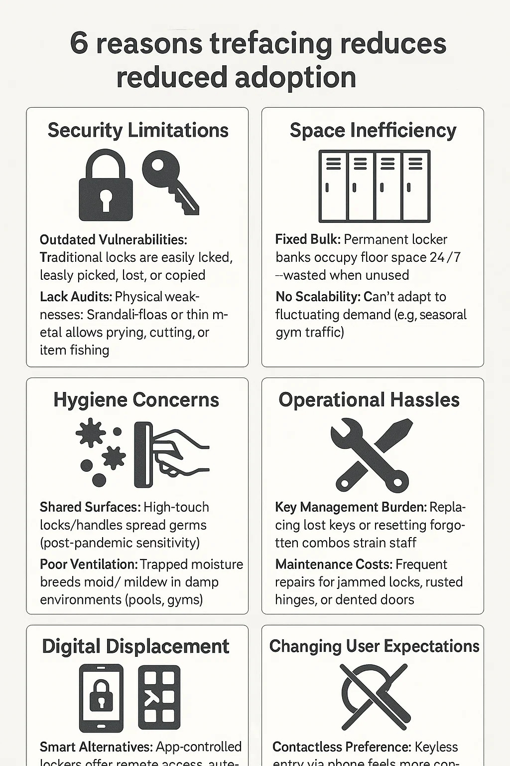 Veraltete Schwachstellen: Herkömmliche Schlösser (Schlüssel/Kombinationsknöpfe) können leicht geknackt werden, gehen verloren oder werden kopiert.